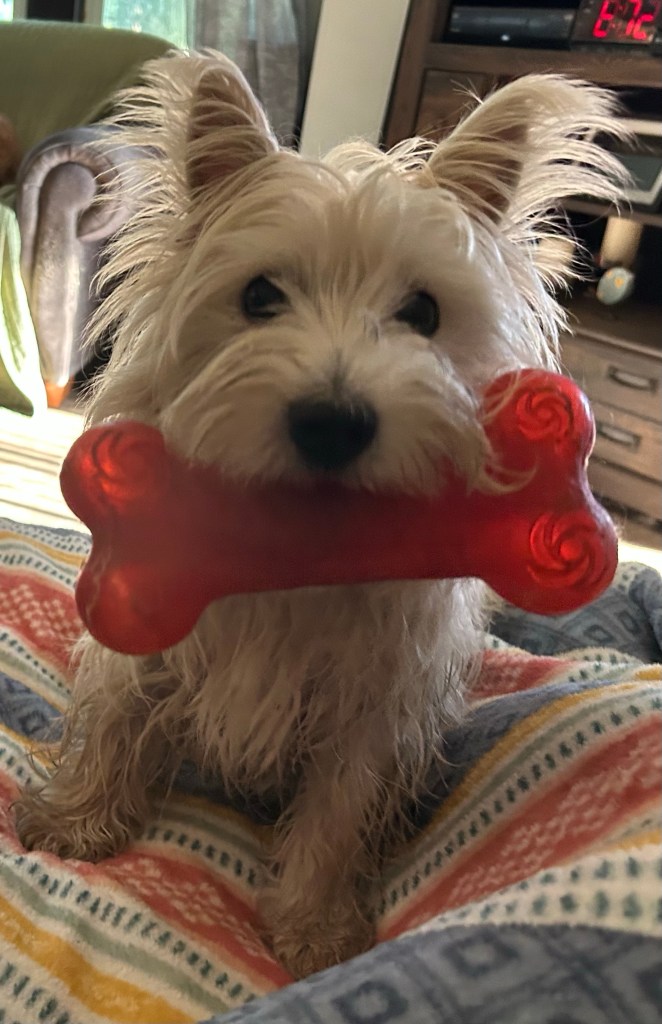 Wishing you a red squeaky bone kind of day! ~ Scruffy. (it even makes baths not so bad)