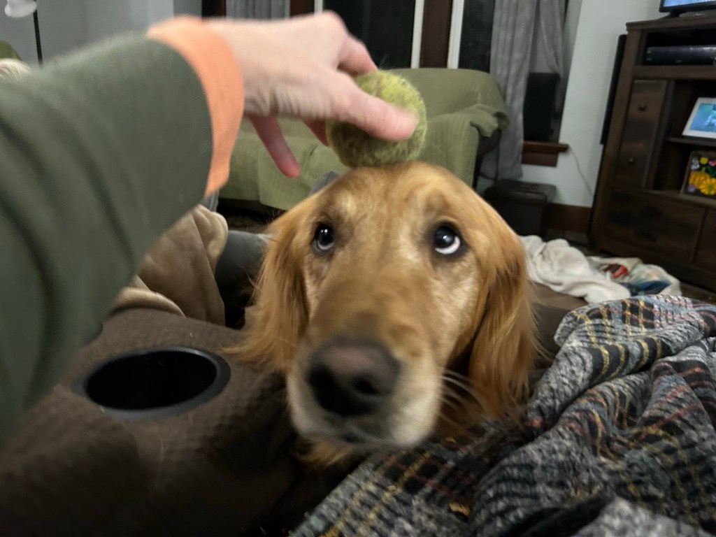 My Margret is goofy sometimes. She wanted to see if I could balance the ball on my head. Now why would I do that if I could be playing catch with it instead. Sigh… ~ Bea Pup