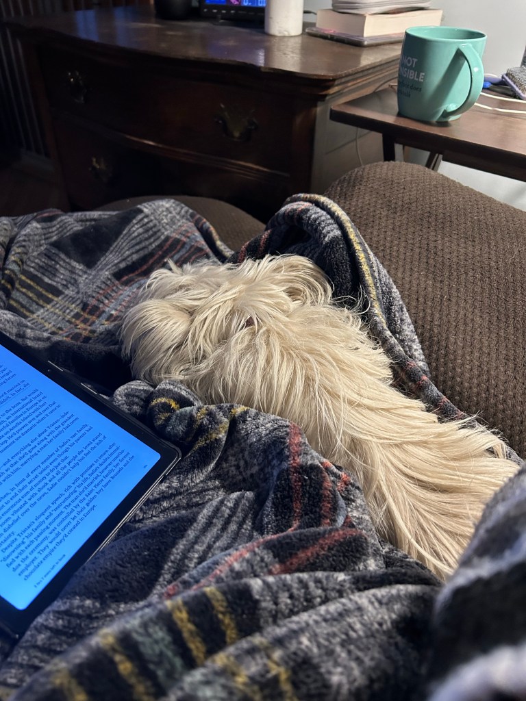 My Margret got up to get more coffee, I slid over to take her place BUT I was nice enough to make room for her when she came back. ~ Scruffy Pup