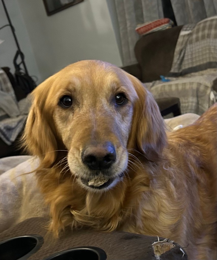 I bring rocks in every night to show My Margret. I stand there and stare at her until she notices me. She’ll ask me if I have a rock and then I move it around in my mouth so she can see part of it better. Then she tells me what she likes best about them and I wag my tail. It’s kind of our thing. 💕 ~ Bea Pup