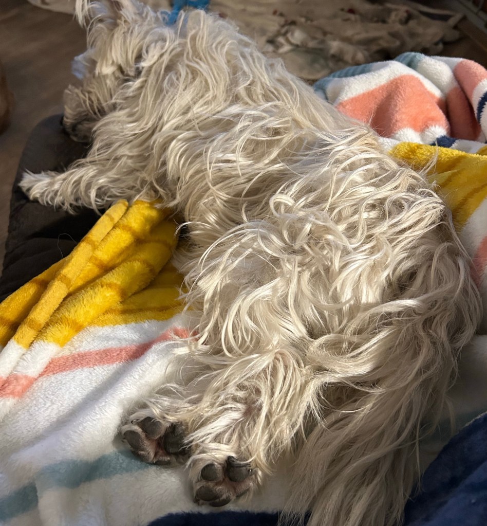 My Margret thinks my feet are extra cute when I lay this way so I try to humor her now and then. ~ Scruffy Pup