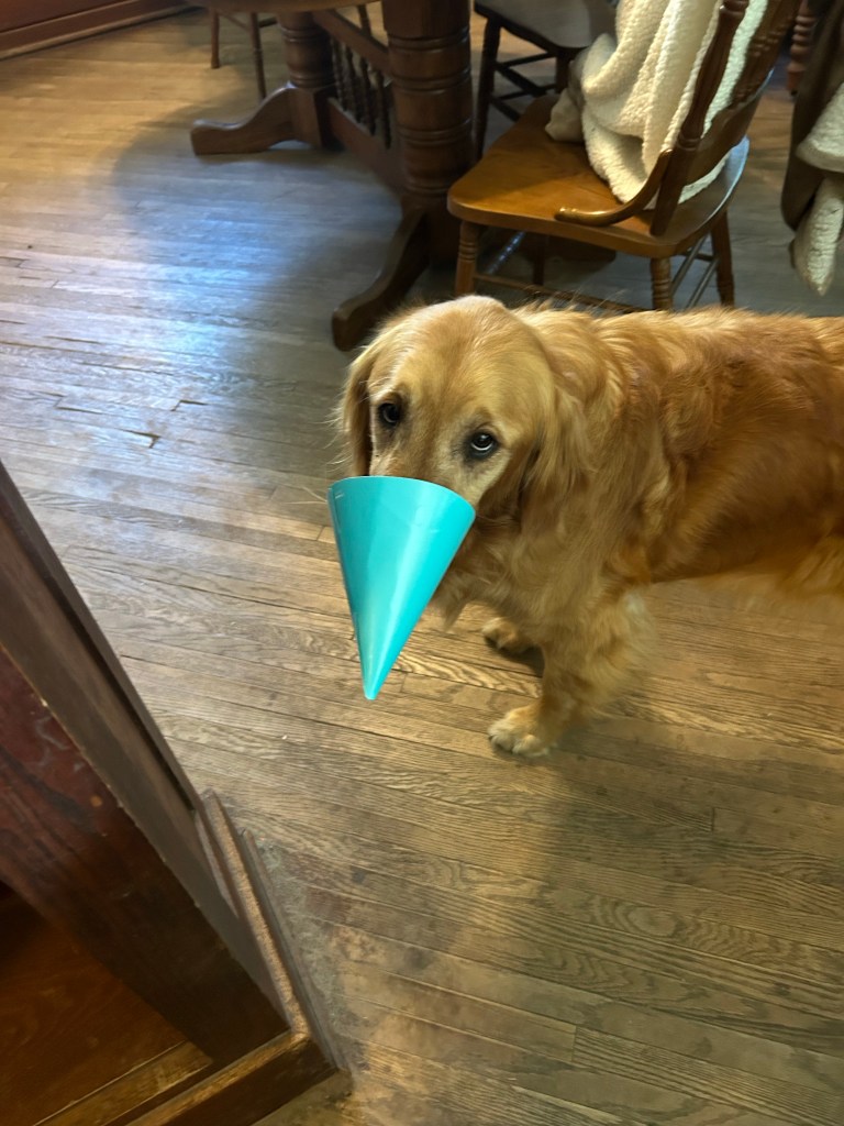Belle: No worries I’ll sneak you an extra treat if you’ll chew that silly thing up. You know how I feel about hats!!!