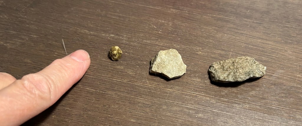 I brought these three rocks to My Margret the other night. The routine is that I bring them in one at a time and stare at her until she asks what I brought her. Then I make sure the rock shows when I grin. She said the first one was so small that when I grinned and showed it to her she didn’t know it was there! I like to keep her guessing like that. ~ Bea Pup