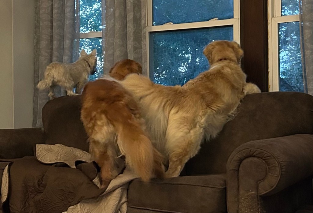 My Greg and we pups make a good team. We let him know when a bunny is in our yard and he (sometimes) goes out and shoos it away. We heard him say it’s so we stop barking and trying to jump through the window but we know he just wants to be part of our awesome bunny alert team! ~ Scruffy, Bea and Bessie Pups