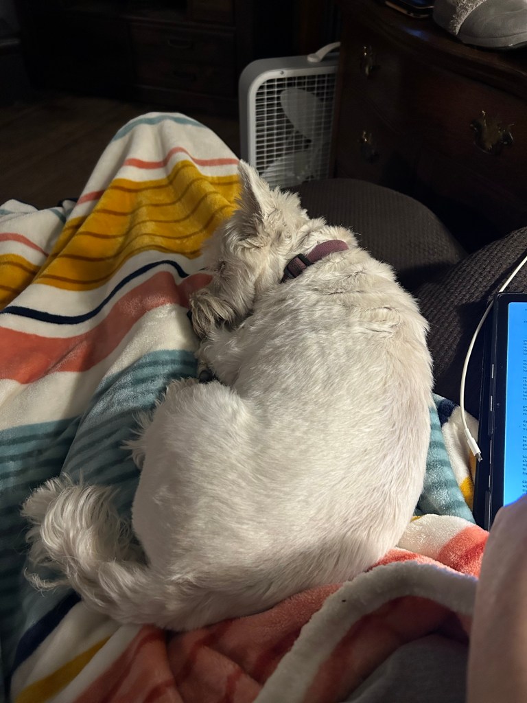 My Margret is silly sometimes. She says she wishes she could bottle the feelings that the gentle warm weight of me sleeping in her lap, combined with my soft ladylike snores make her feel. Like I said silly, but she’s mine. ~ Scruffy Pup