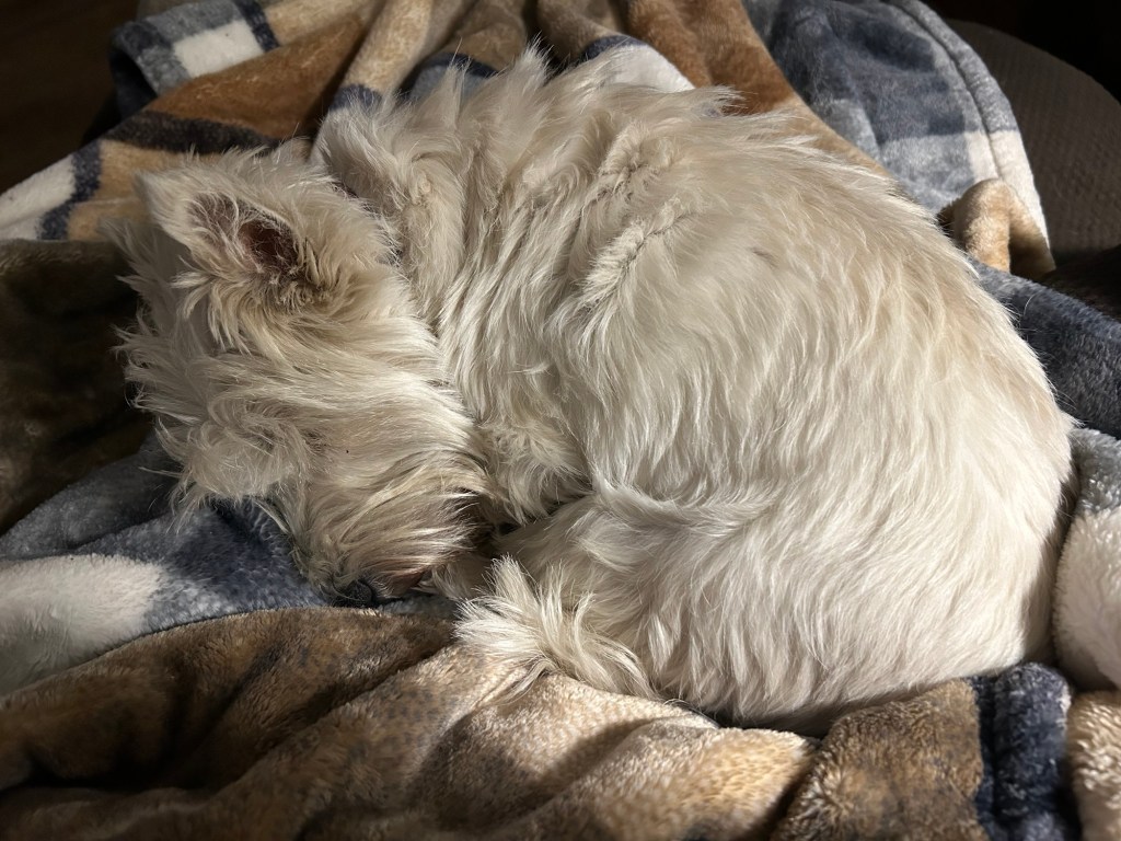 My Margret told me she had to get up and start her day. I replied with a gentle sigh and snuggled in closer. At that she picked her book back up and had another sip of her coffee. Mission accomplished. ~ Scruffy Pup