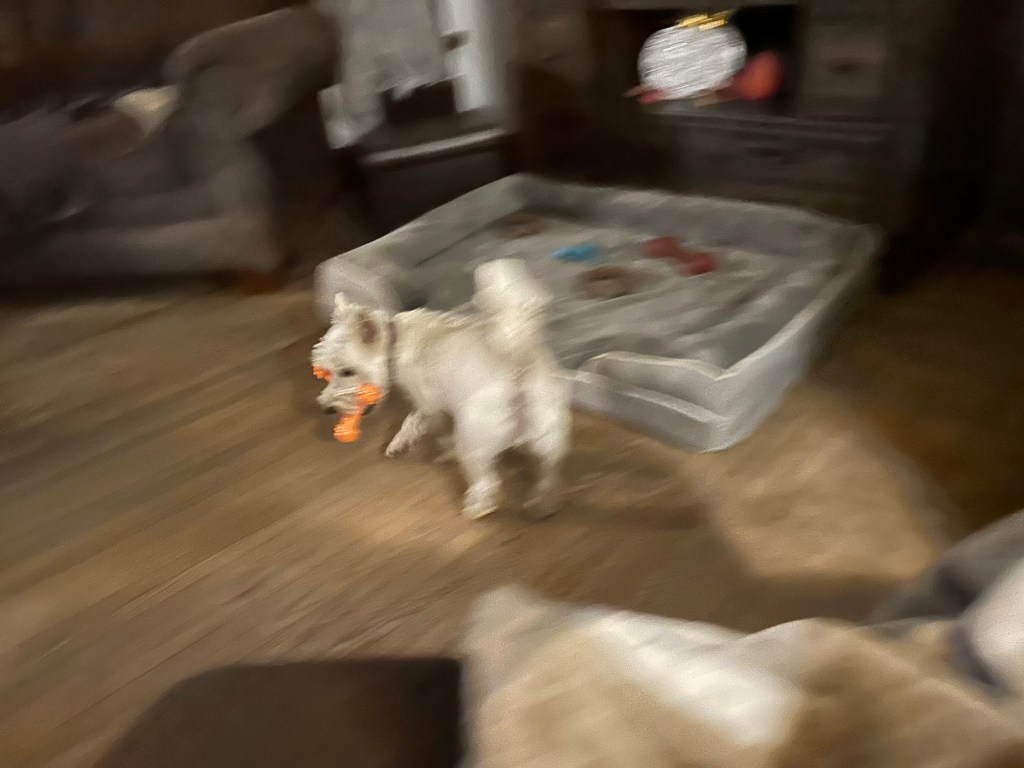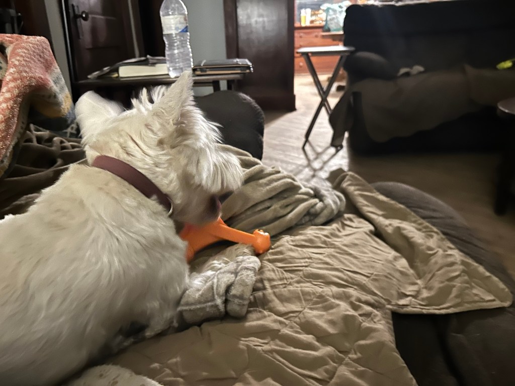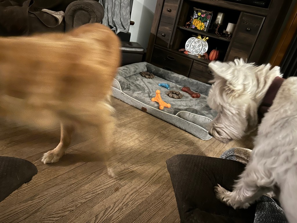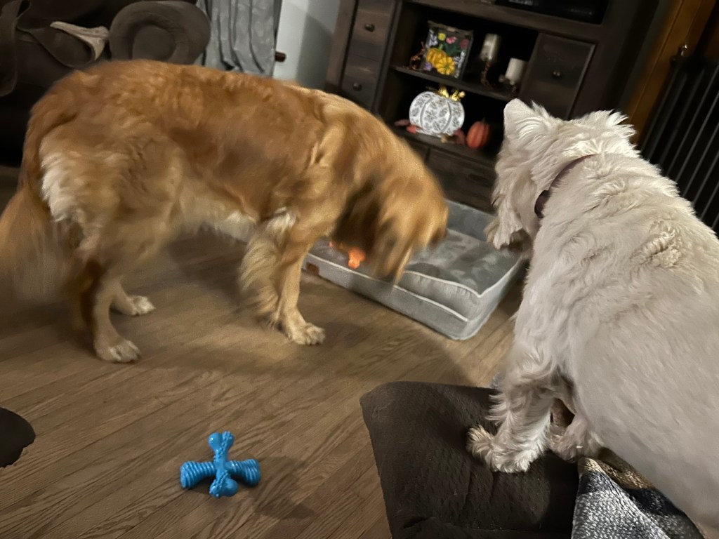 You know when your big sister gets to the toy first, plays with it, walks away and you take it, then she brings in another toy drops it in front of you, takes the first one puts it in the toy bed comes back and picks up the toy she just “gave” you, then you get the toy from the toy bed that you wanted in the first place and start chewing on it only to have both of take a nap after a couple of minutes because you wore yourselves out! Yeah that. ~ Scruffy Pup