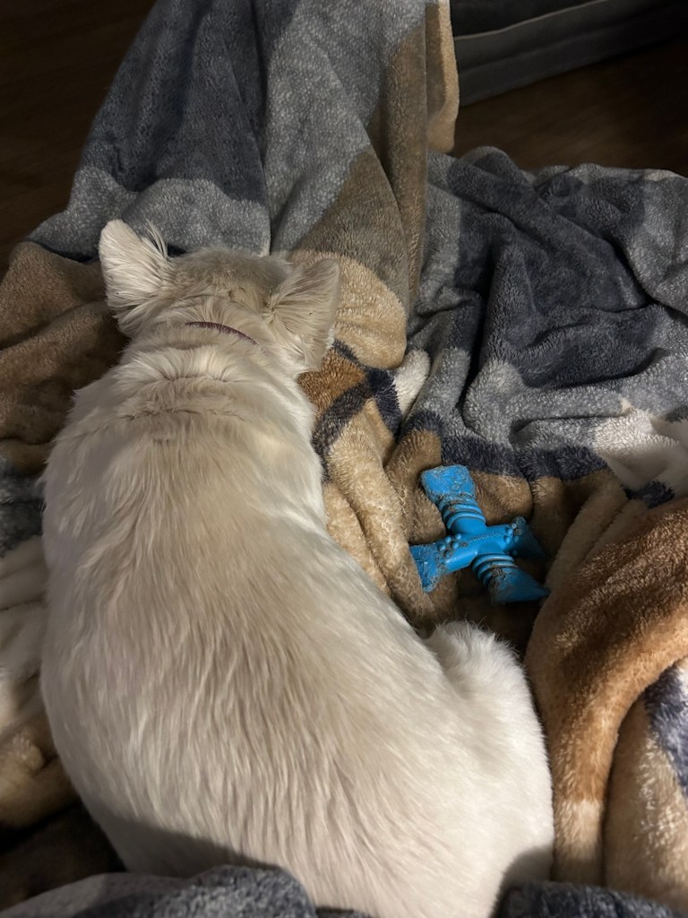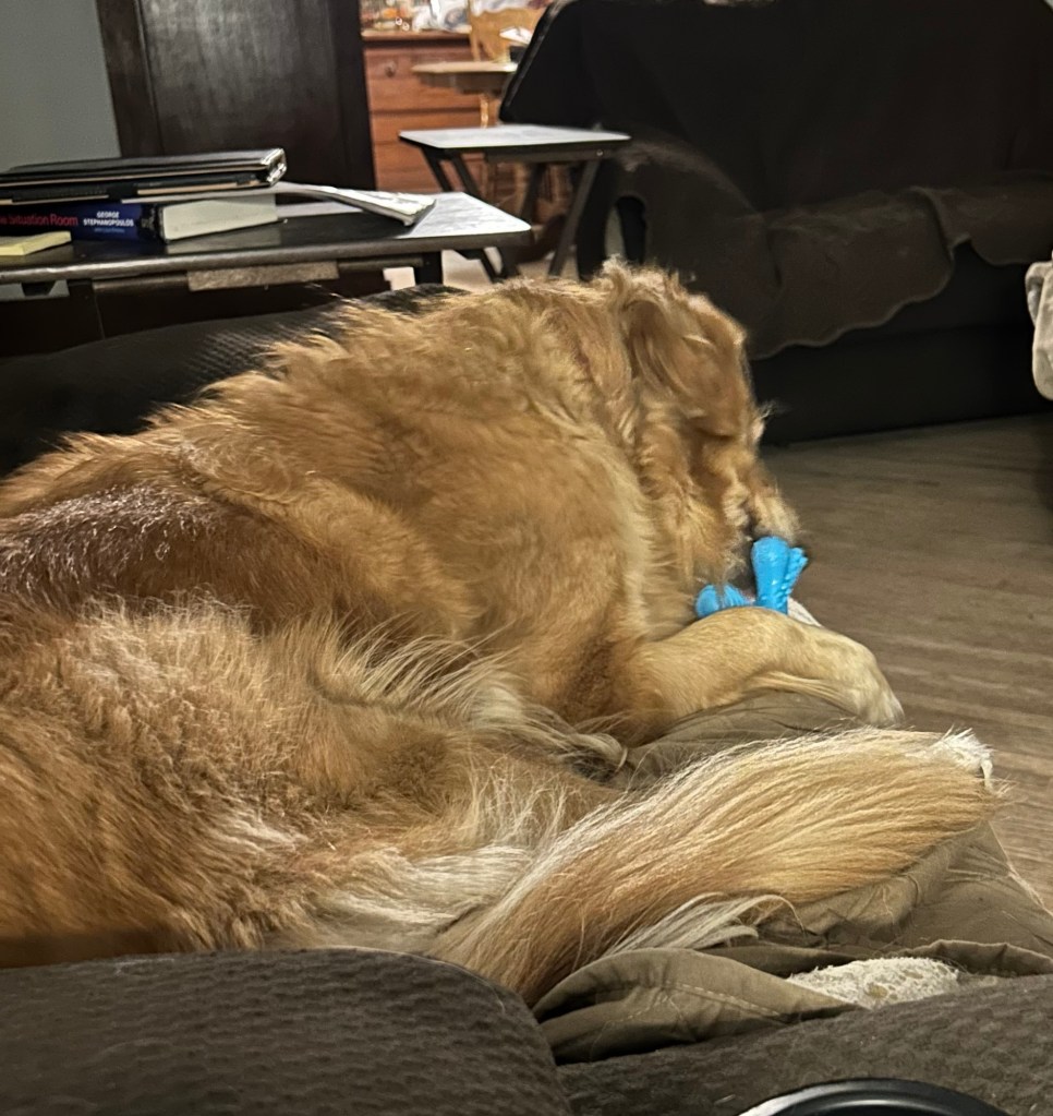 You know when your sister has the chew toy you want, so your My Margret puts another chew toy just like it next to you, but it’s just not the same so you grumble growl and sigh about it while she gently pets you and says “I know” in a soft voice until you go to sleep. Yeah that… ~ Scruffy Pup