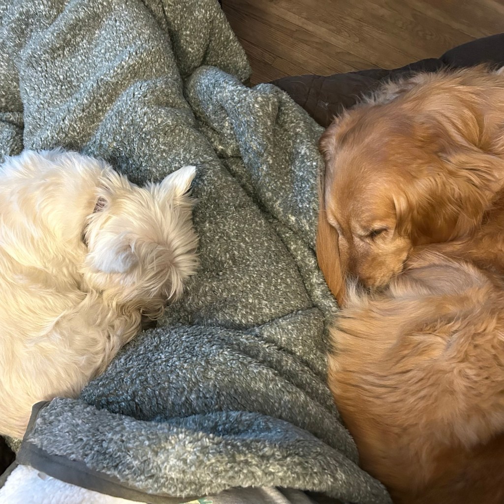 I don’t know Scruffy, but she said in that soft gooey voice while she ruffled our ears so it must be something good. Go back to sleep. ~ Scruffy and Bea Pups