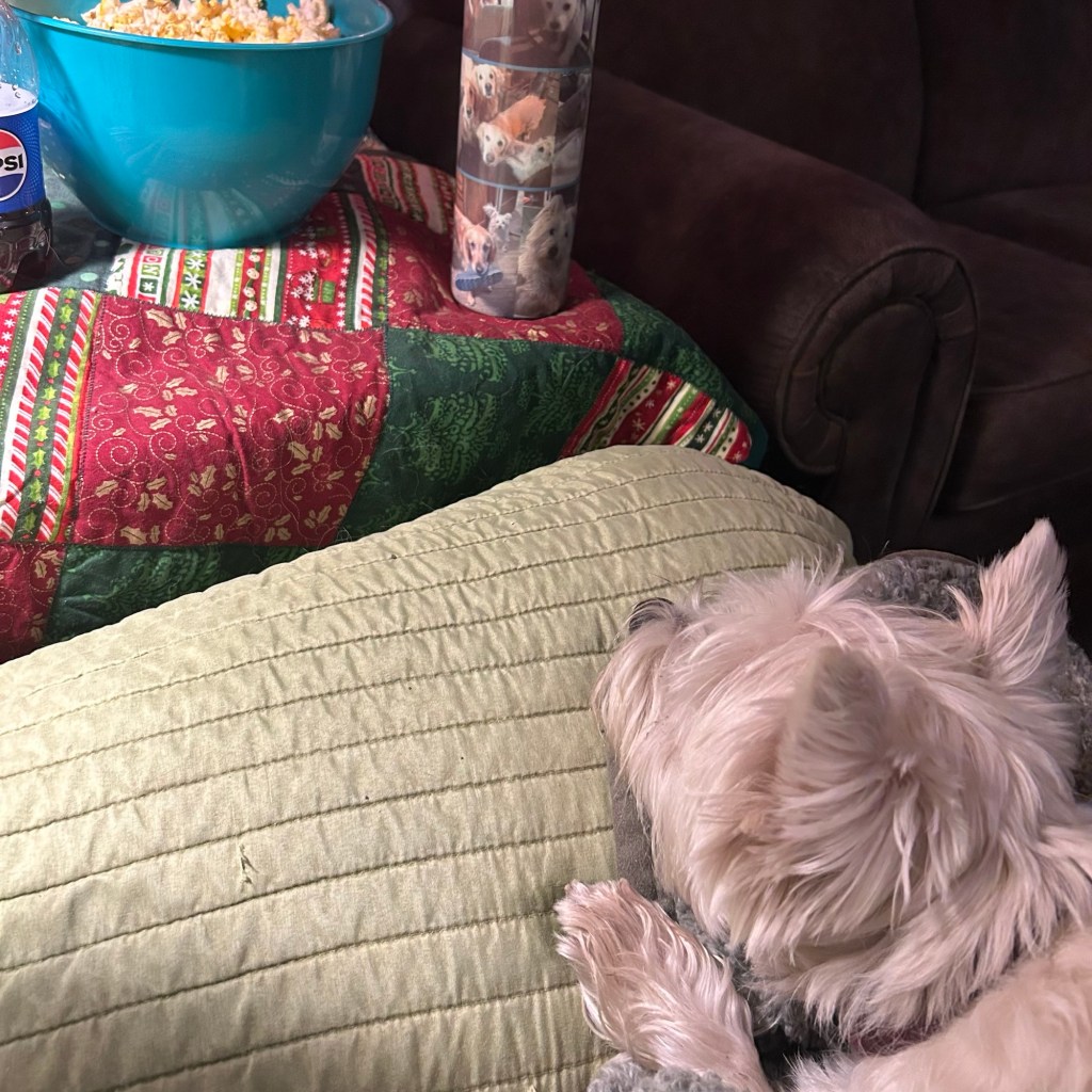 Shhh…maybe My Margret won’t notice if I keep scooting closer to the popcorn. ~ Scruffy Pup