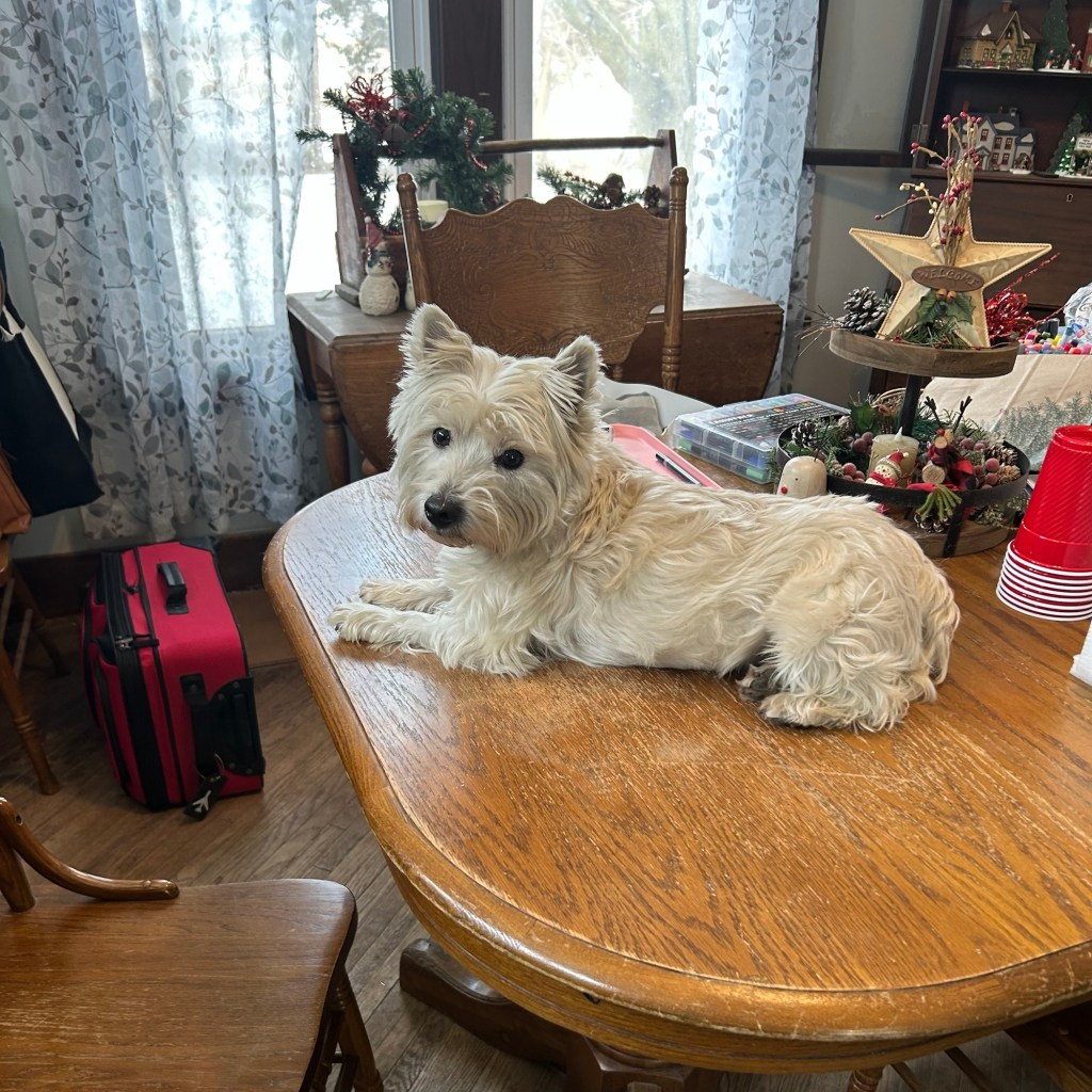 What do you mean I can’t be up on the table? I like it up here! ~ Scruffy Pup