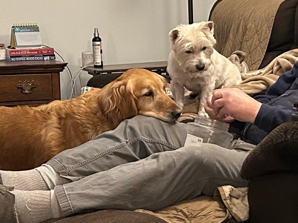 While begging…um…asking hopefully…for peanuts it sometimes hurries up the treat when one ups the cute by a head tilt or placing one’s nose on your person’s knee. ~ Scruffy and Bea Pups