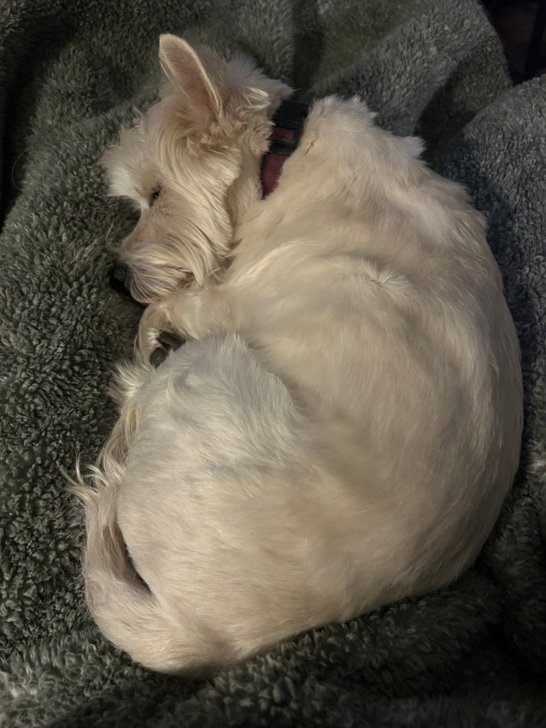 My Margret says when I curl up with her like this she doesn’t want to get up and start her day. I say mission accomplished! ~ Scruffy Pup