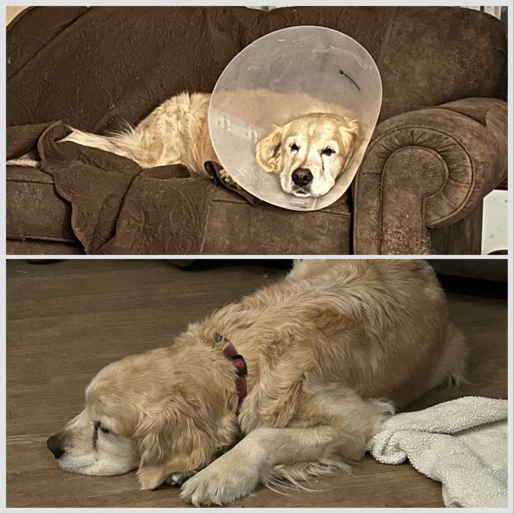I’m home! Take my advice, no matter how much that pea gravel in your yard looks like your kibble don’t eat it because it’s not! Oh and I. Do. Not. like wearing a cone, I keep running into things and my sisters bark at me. I don’t think they recognize me in this thing. So I gave my Margret my saddest look (and it must have been a good one because she’s not a push over.) and she took it off saying we’d give it a try and it was up to me if it stayed off. I’m not sure what she thinks I’m going to do but ok. My Margret just gave me something to help my tummy feel better so I’m going to take a little nap now…Zzzz