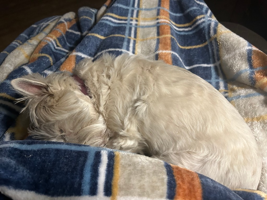 My Margret said the weather is going to get colder today, something about rain this morning, storms this afternoon then snow overnight. I’m glad I still have my nose warmer upper blanket handy. ~ Scruffy Pup