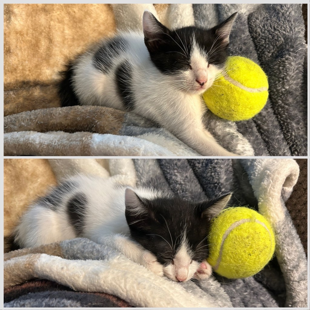 Mmm the tennis ball pillow it isn’t bad but I like my paws better. ~ Gus Gus Kitty