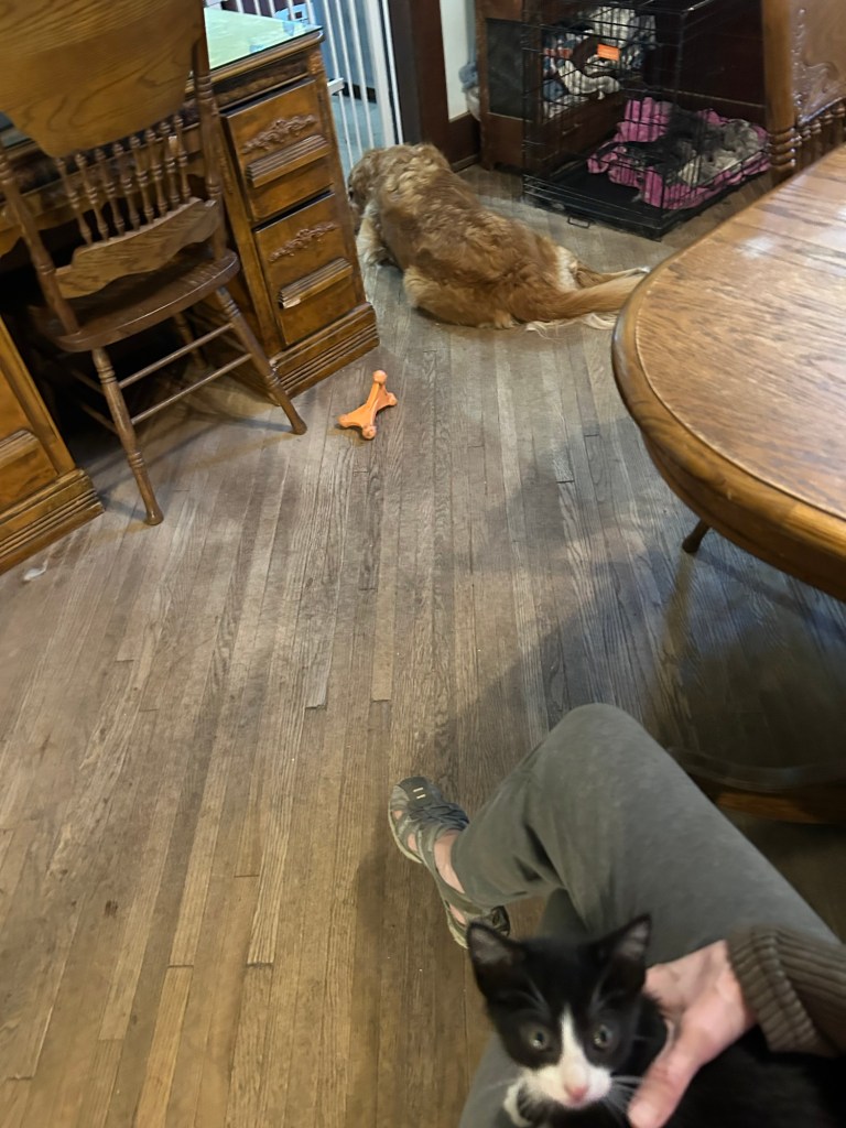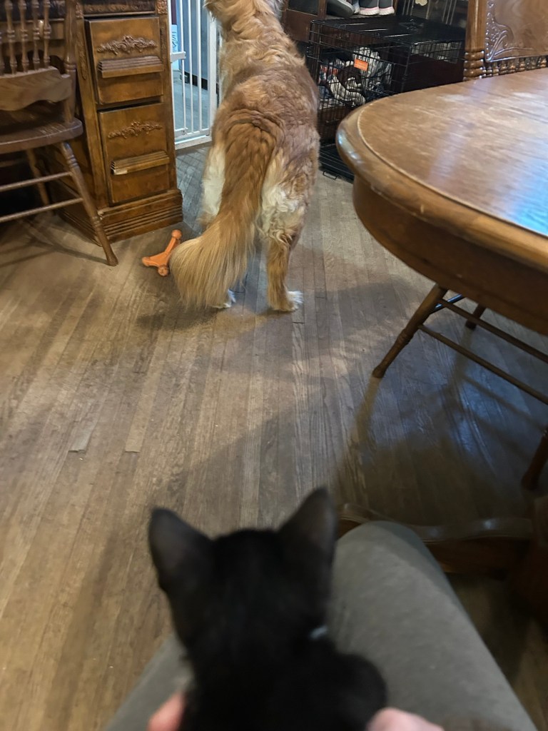 This morning Bea and Graham met nose to nose. I wasn’t able to get the close up pics because my two hands were busy holding a kitten and petting a golden retriever. After the introduction at the kitten palace gate and the “getting to know you time” in the dining room we moved into the living room. Graham was purring on my lap while Bea was laying at my feet. Both were relaxed and happy. I couldn’t have asked for a better result. When the opportunity arises we will introduce Graham to Bessie. 😊 ~ My Margret