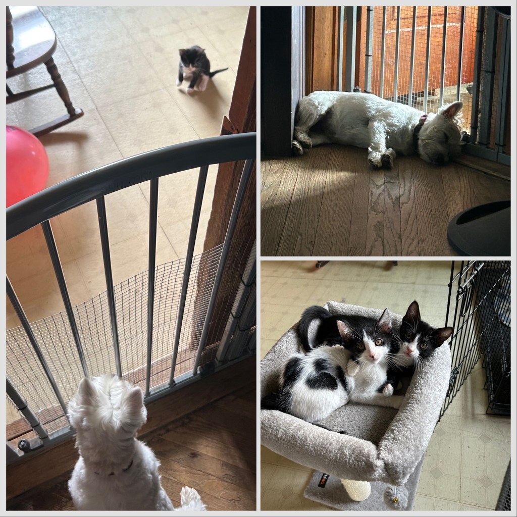 Successfully introducing kittens and adult dogs take patience, baby steps and lots of time. Yesterday with Greg supervising, the door between the “kitten palace” and the rest of the house was open for several hours with the child gate remaining shut. The pups were in the house and would go up to the gate to check things out.