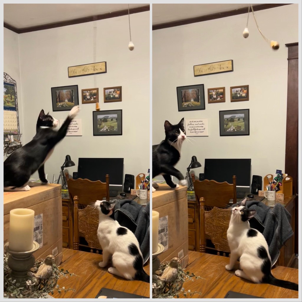 Best game ever (so far) first you bat at the pull cord, then you just sit back a watch it swing! ~ Graham and Gus Gus Kitties