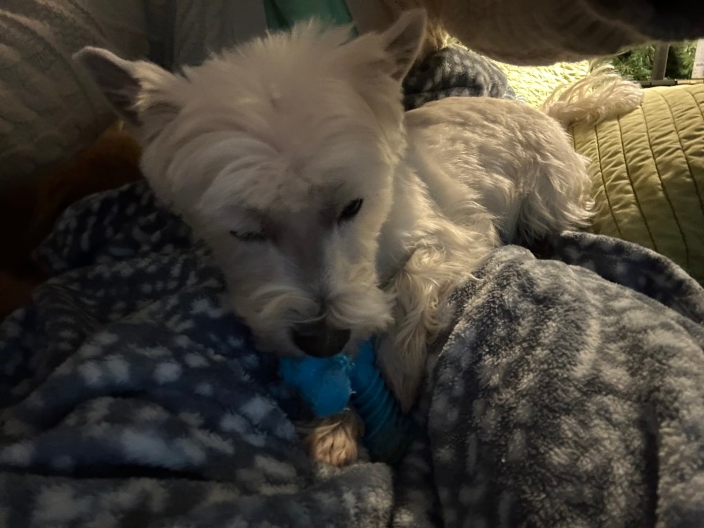 All that early morning barking you heard during the last 30 minutes? Scruffy wanted the “good” blue X chew toy that her sister had. 🙄 ~ My Margret