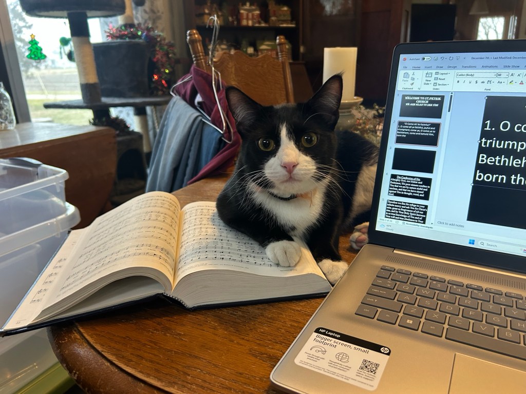 My job is to hold the page down while My Margret types the slides for the power point. The fact that I’m laying on the page she needs to see is immaterial. ~ Graham Kitty