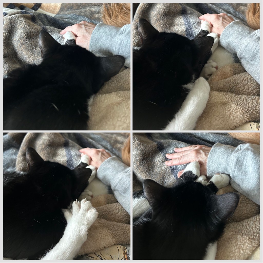 It doesn’t matter if it’s one, two, or three paws, when napping my “security blanket” is to always be touching who I’m snuggled next to. Sometimes Gus tries to sneak in his paw too! ~ Graham Kitty