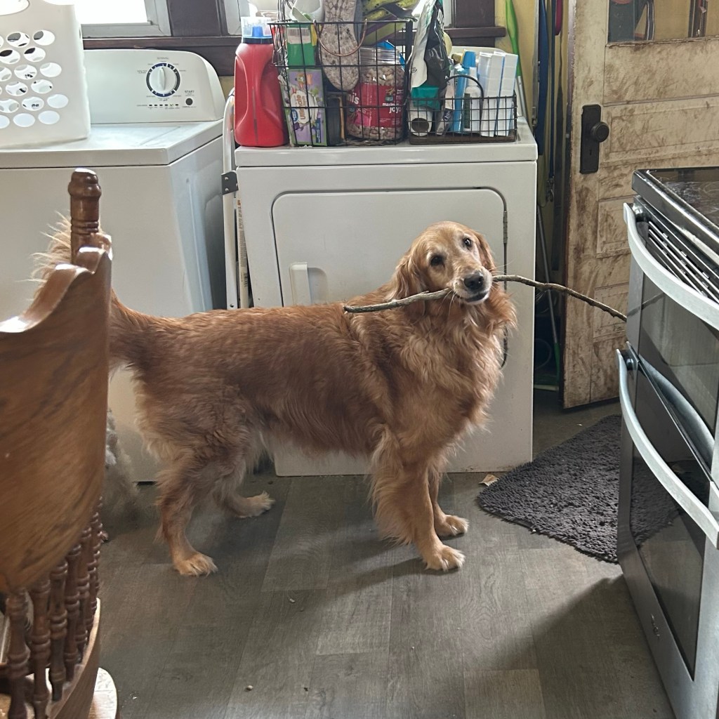 Did ya see, did ya?!? I brought this awesome stick in through the dog door! Now if I can just figure out how to get it back out. ~ Bea Pup