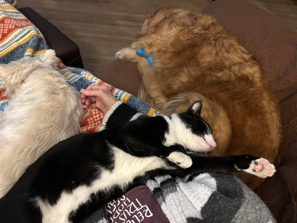 Snuggle buddies make it easier to stay warm when the windchill is -20. ~ My Margret, Bea and Scruffy Pups and Graham Kitty