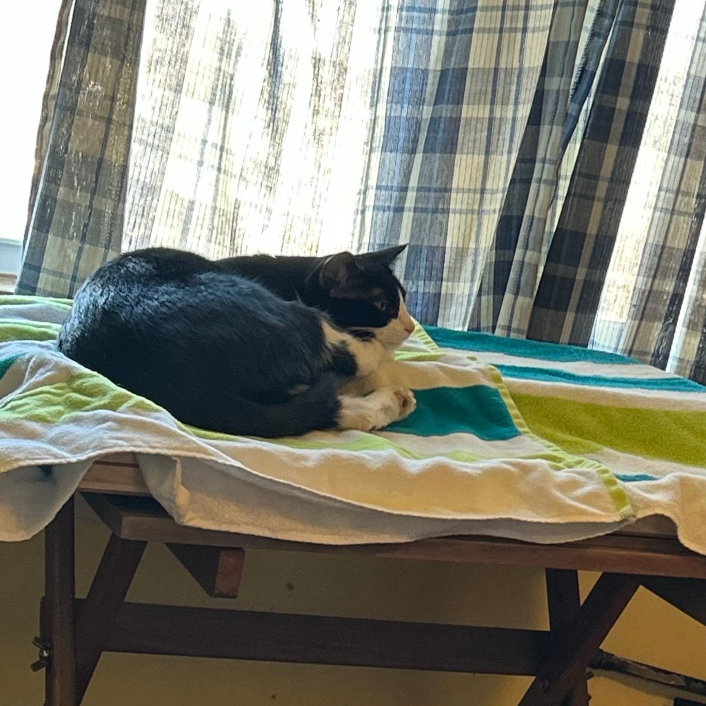 You know when you discover My Greg’s puzzle board but before you can hide any of the pieces My Margret covers it so you decide to nap there instead. Yeah that. ~ Graham Kitty