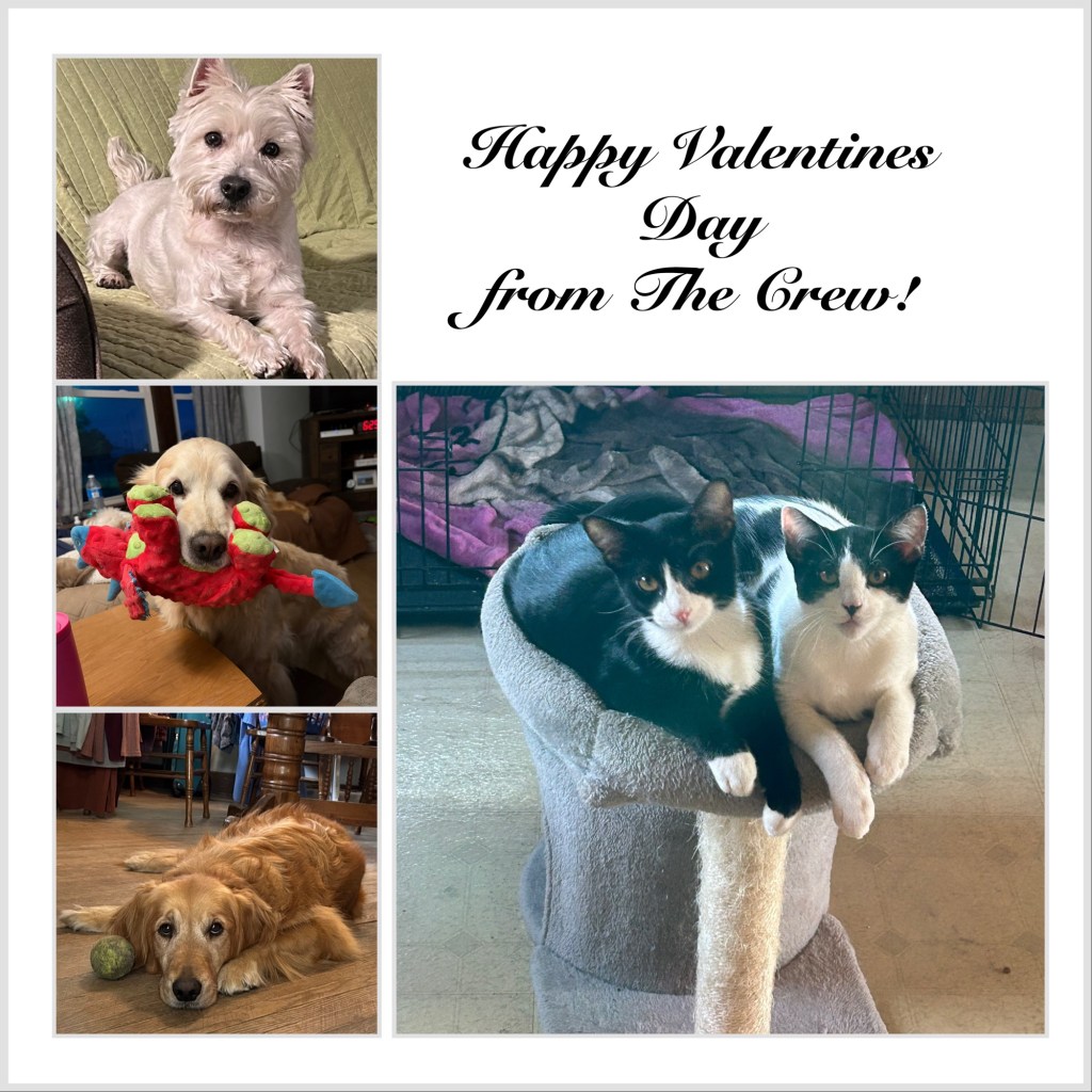 Wishing you a day filled with what you love the most! Scruffy, Bessie, and Bea Pups and Graham and Gus Kitties and their People 💕