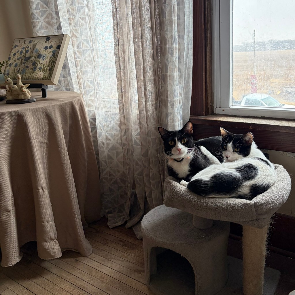 Bessie and Scruffy Pups have been giving us “watcher of all things” lessons. This observation point on the stairway landing is one of our favorite places! ~ Graham and Gus Watcher Kitties
