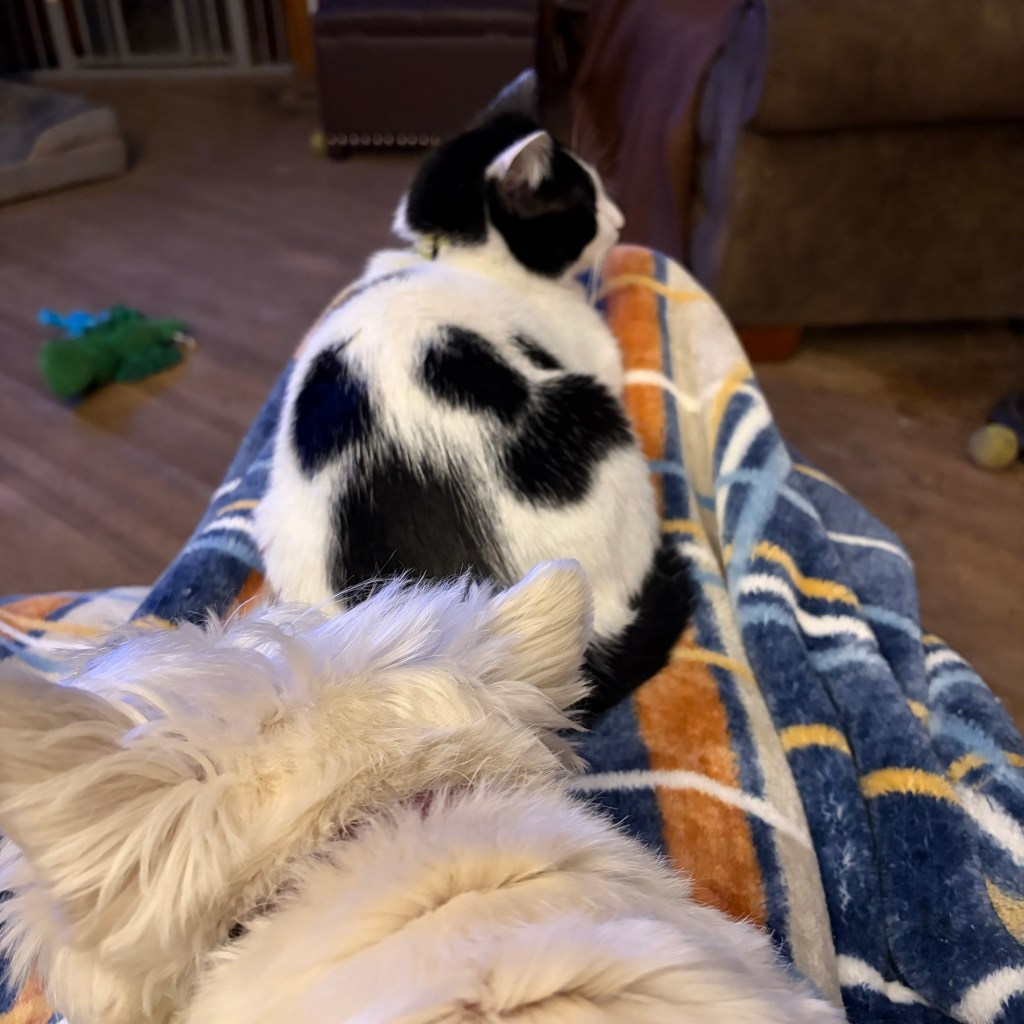 Bea Pup showed me just where to sit so My Margret’s chair will gently rock. I like it, it reminds me of when I sit up in the tree and the branches sway in the wind. ~ Gus Kitty
