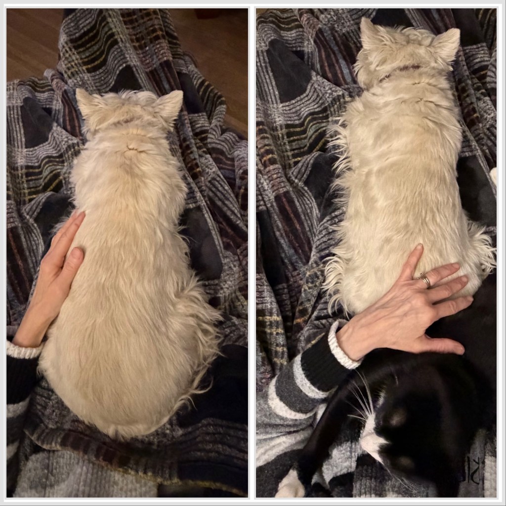 Early mornings are always my snuggle time with My Margret. I don’t like it when I have to share. But My Margret says there’s enough room and love for all of us. Sigh… ~ Scruffy Pup