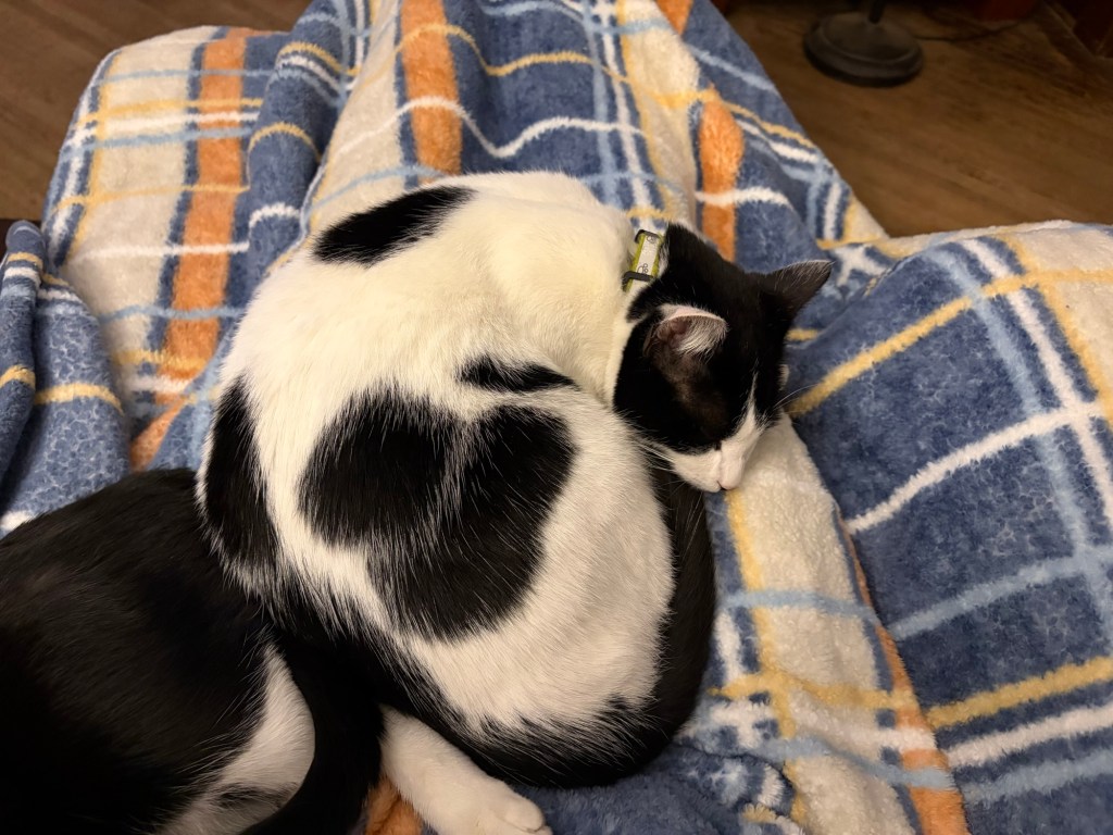 I’m sleeping off my latest adventure. Last night I snuck out and climbed the tree after it was dark. I startled a big bird who couldn’t get away from me fast enough and made a lot of noise. I’m a brave Kitty but I admit loud noises scare me a lot.
