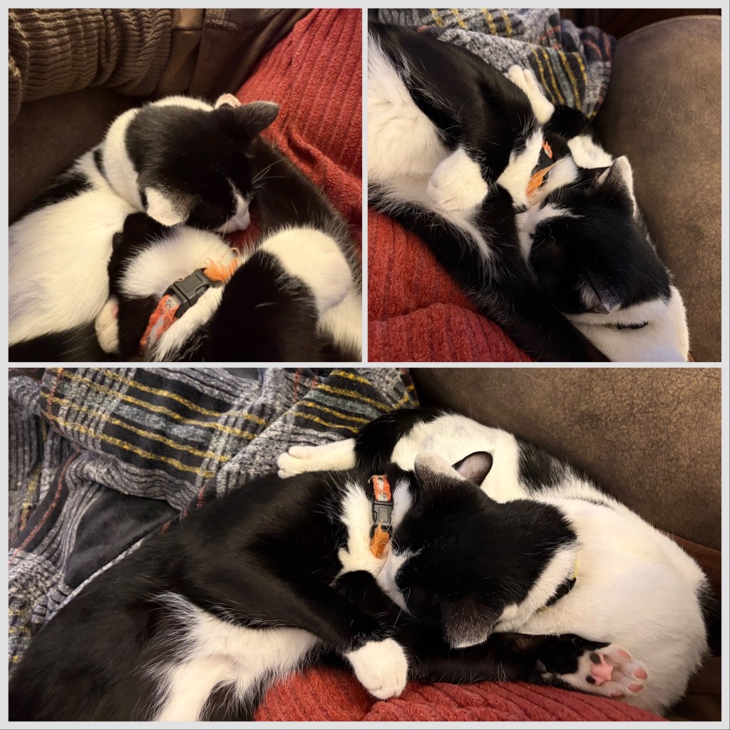 We like to make people search and think now and then. We give you the Kitty Cat Pile-up. Can you untangle us? ~ Gus and Graham Kitties