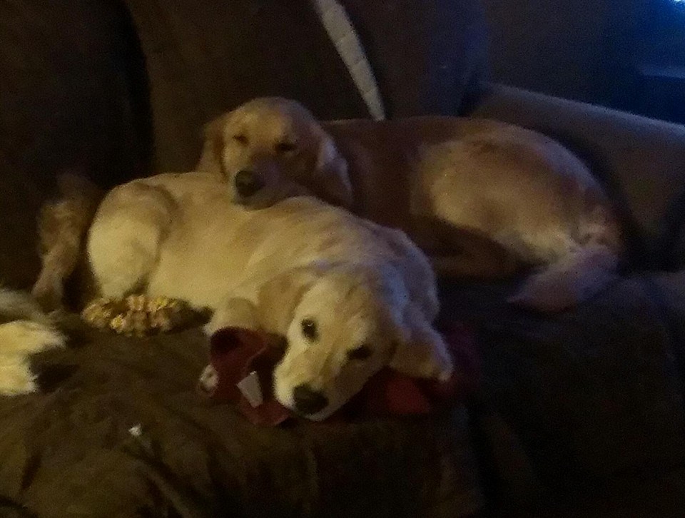 Belle has relaxed her “I’m the responsible alpha dog” and has been simply having fun playing and snuggling with Bess.