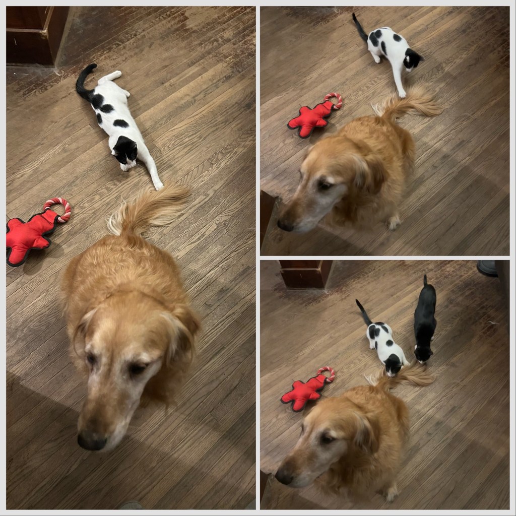 Note: This morning Bea let me know by taking the end of the leash out of my hand that she no longer needed to be leashed when with the kittens. She was right. Scruffy is still learning that Bea just wants to play with the kittens, and barking to let me know that Bea is by the kittens isn’t always necessary. Redirection for both dogs in the form of learning to shake is proving to be sucessful. Scruffy is offering her paw more often to be shook and Bea is moving from shake to high five. Graham still doesn’t like “dog germs” and will vigorously lick any spot that has been sniffed. And Gus, well that sweet boy is getting braver and braver. Progress! 💕