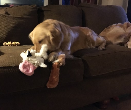 I’m so excited! My Margret was cleaning and found our tennis balls under the couch. As you may remember I have a hard time getting the tennis ball to squeak while my sister Bonnie is a show off and squeaks it non stop. But today I tried really hard and as the video proves I can squeak it almost as good as Bonnie can.
