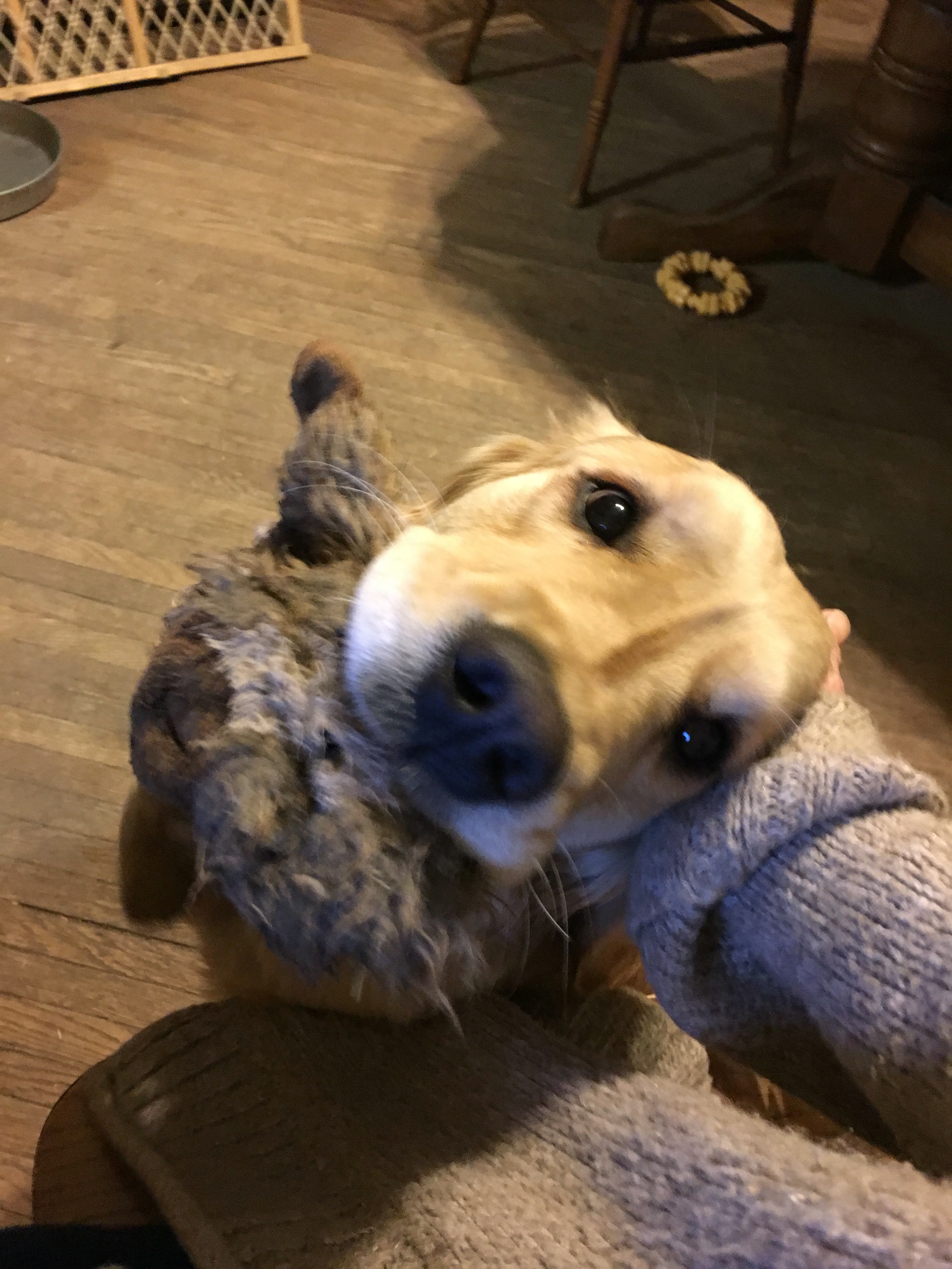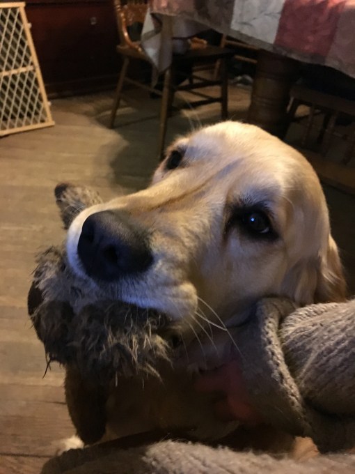 Bess is never too far away from her stuffies. She usually has anywhere from 1-3 of them in her mouth at any given time.
