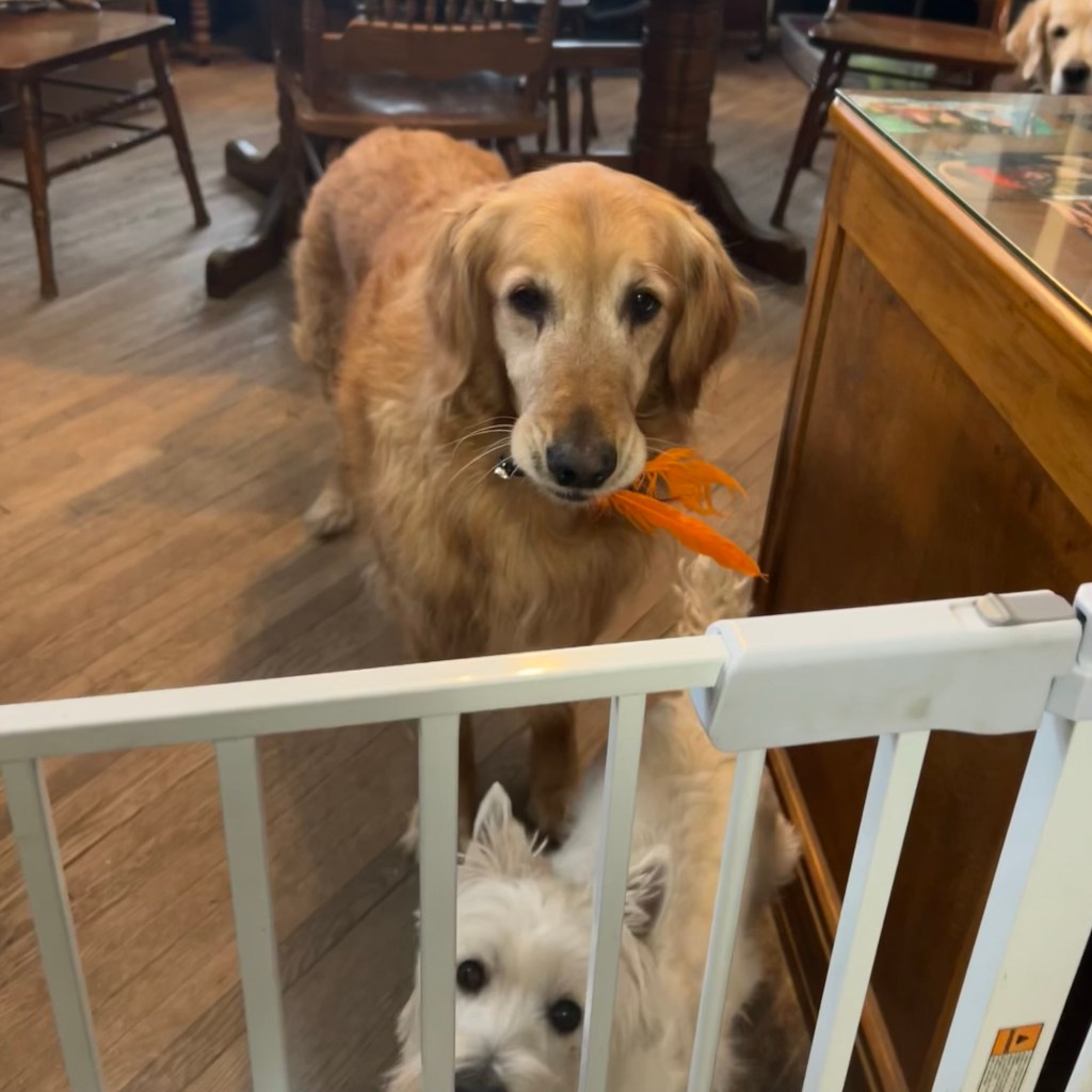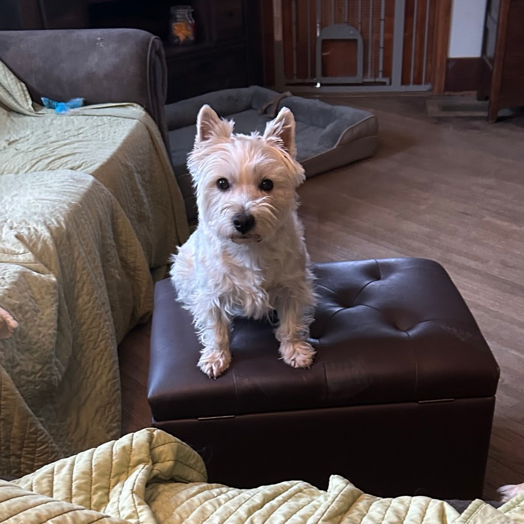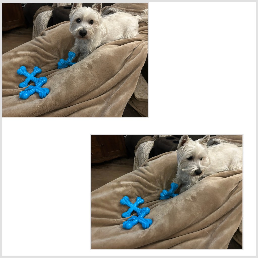 All that early morning barking you heard during the last 30 minutes? Scruffy wanted the “good” blue X chew toy that her sister had. 🙄 ~ My Margret