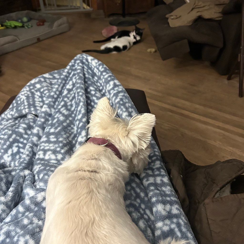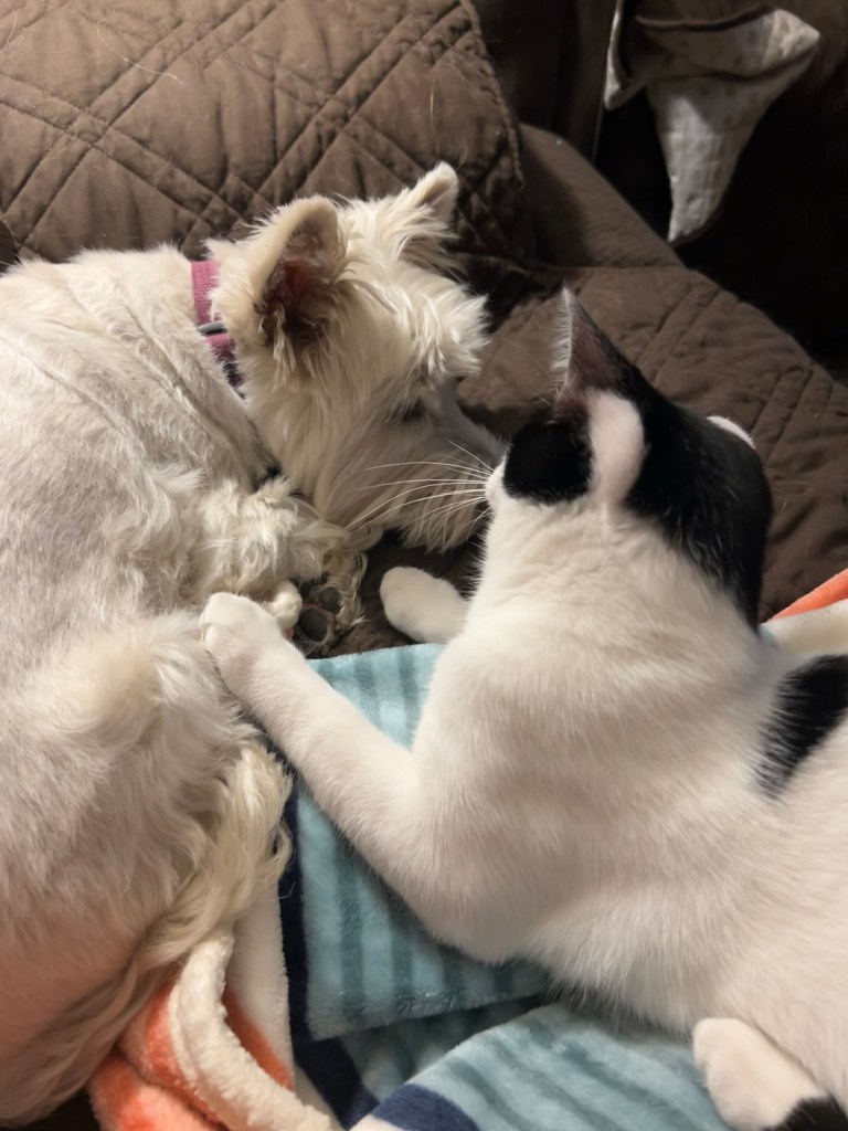 Bea is coming around and will only bark short barks then settles in to watch them. She gently nosed Graham the other day wanting to play and he rewarded her by smacking her nose a couple of times and hissing at her. Bea retreated to the other side of the loveseat, turned her back on him and gave me a “what was that” look! Graham won that round. 😂