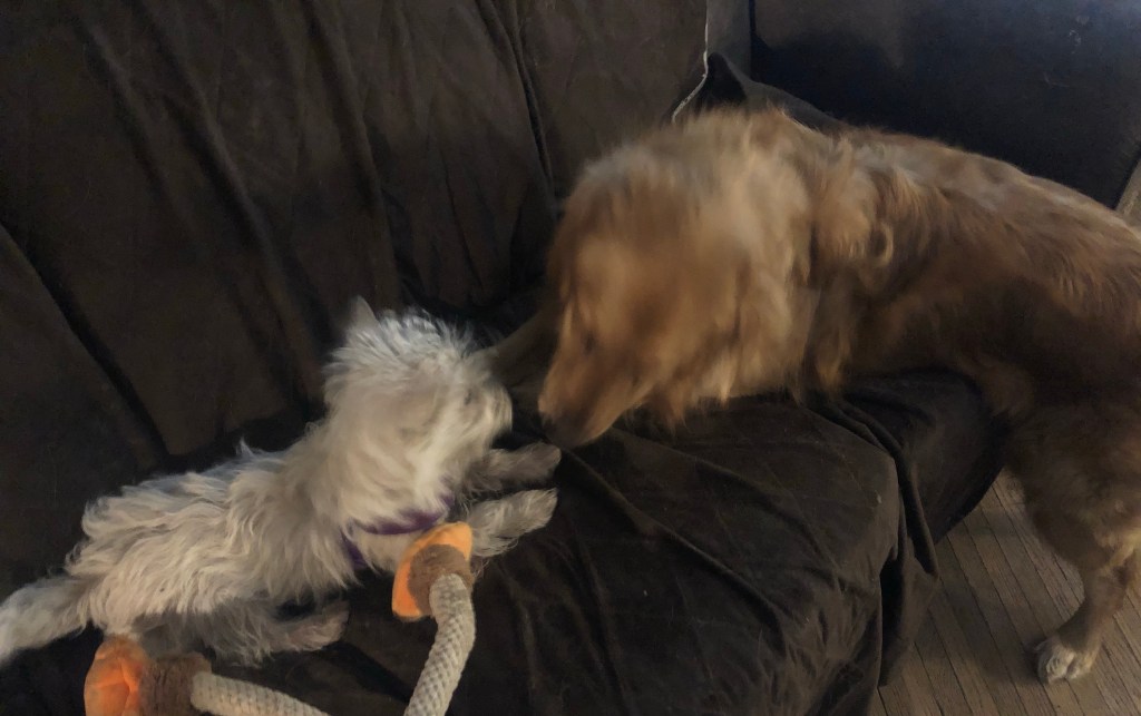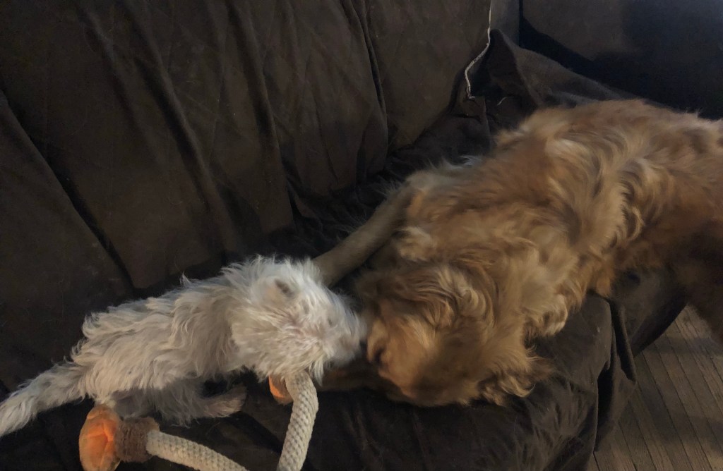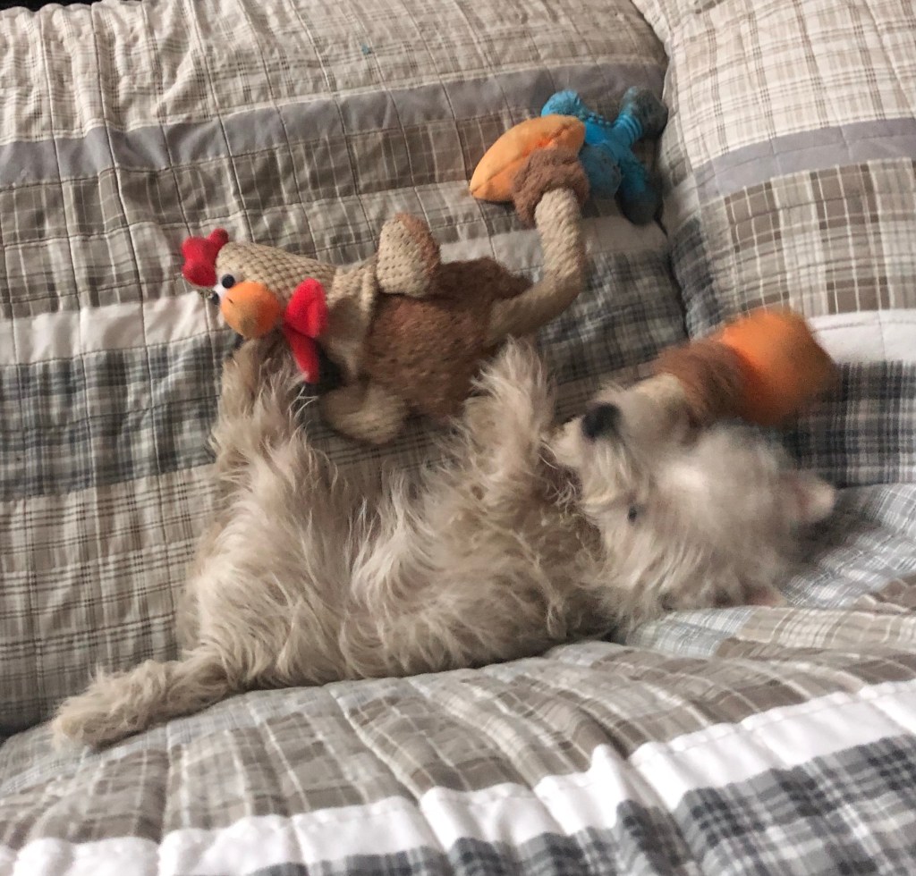 Pondering the question “Can you ever have too many chewy toys?” “Hmm… nope” ~ Bessie Pup