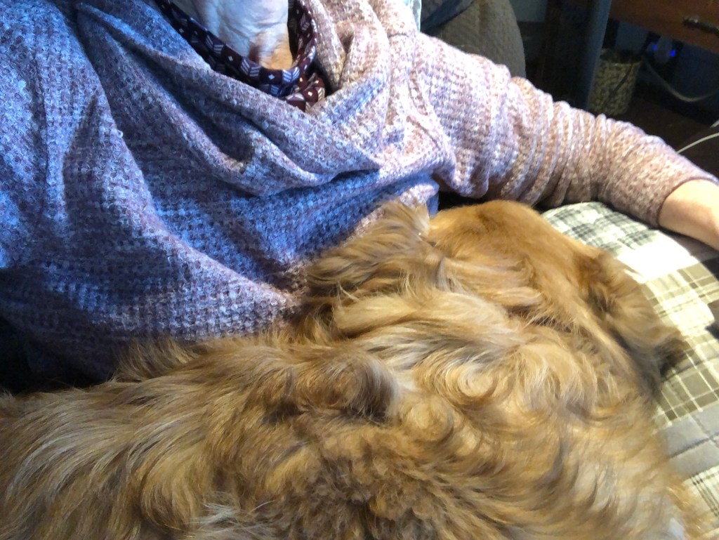 “It’s mine now, you got up.” Lesson for today: Always be alert for the opportunity to snag the coziest blanket. ~ Belle Pup