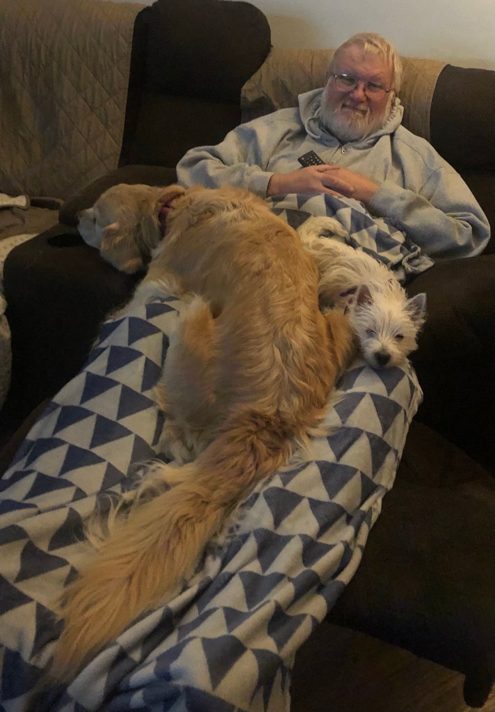 Napping on a Sunday afternoon with my Greg and Bessie Pup is the best! ~ Scruffy Puppy (Note: Bessie was the last holdout, she finally has gotten used to her pesky littlest sister. They cuddled together for quite awhile. 💕 )