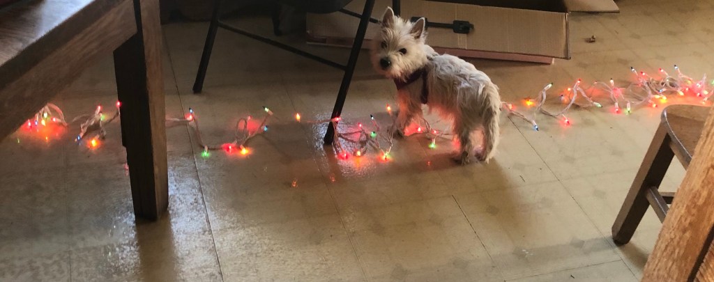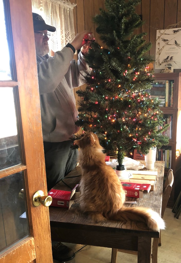 “A little to the left and up just a bit.” ~ Linus Kitty the Christmas tree light supervisor.