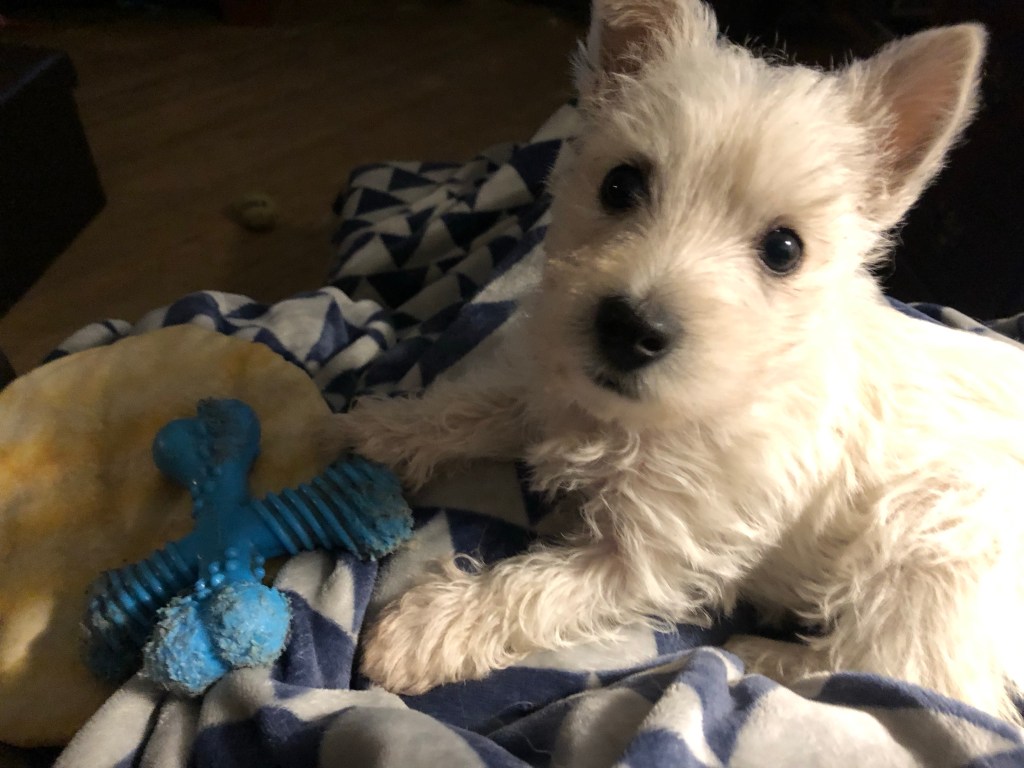 I had my vet appointment yesterday, my shot didn’t hurt at all. Dr. T loved on me and said I was perfect. She said that she’d love to scoop me up and tuck me in her pocket and take me home with her. Oh and the best thing I weigh 4.5 lbs now. I’m almost as big as my sisters! ~ Scruffy Puppy