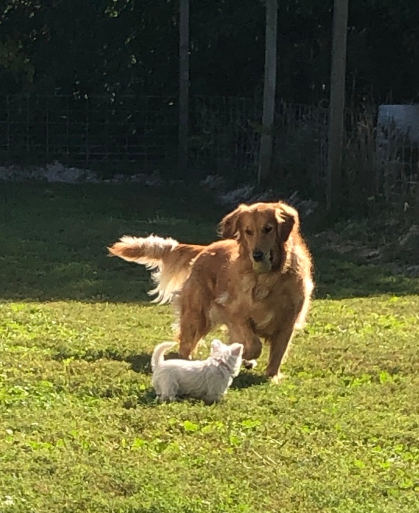 I don’t know who you are you big black dog but this is MY yard!!! ~Scruffy Puppy