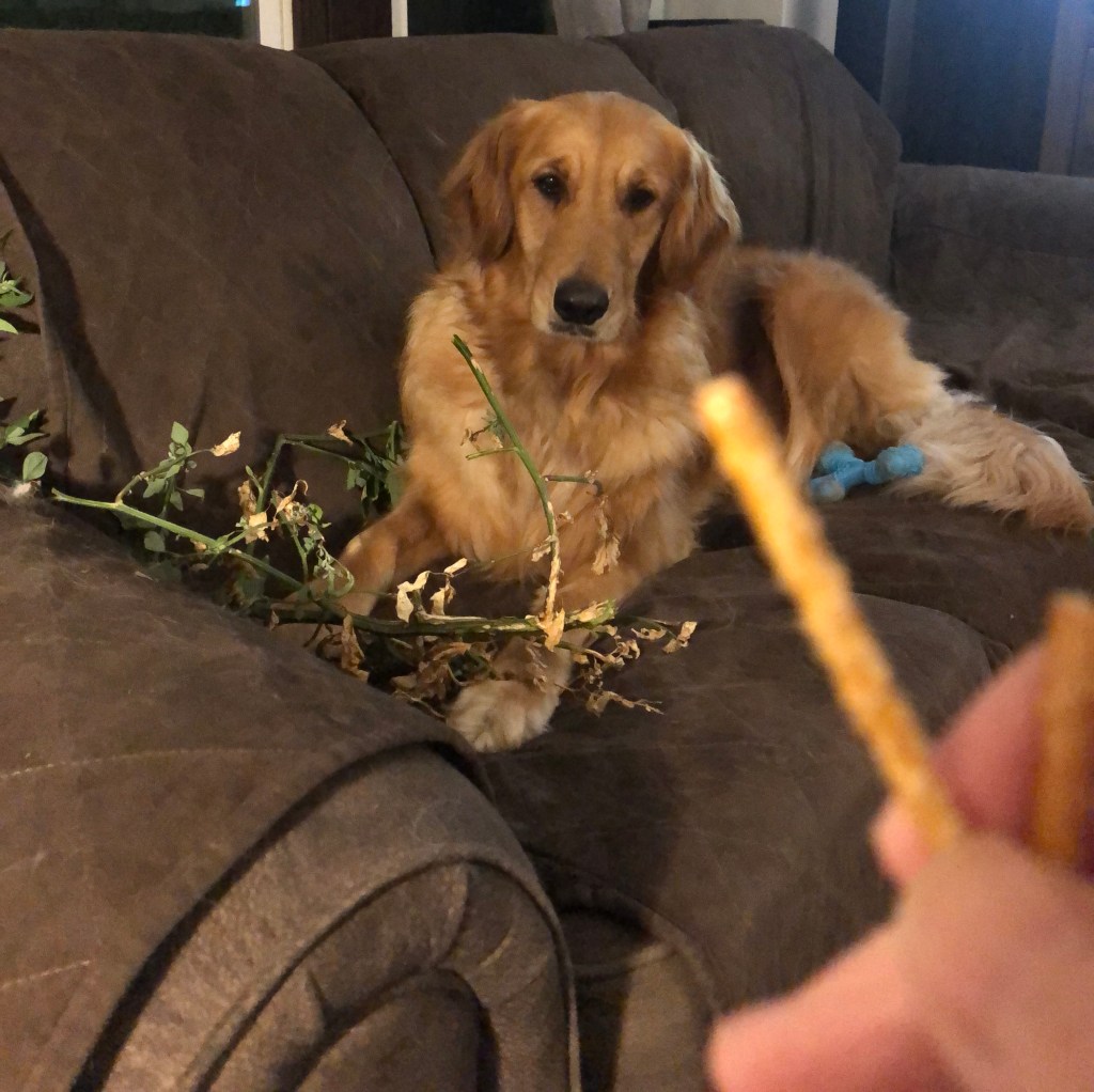 Hmm, you want to trade my “stick” with crunchy leaves for a pretzel treat? Okay!!! ~ Bea Pup