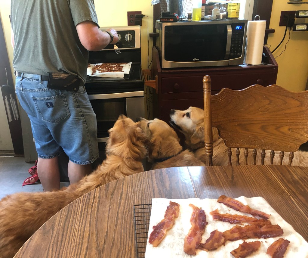 We are the bacon making supervisors. We’re sure that you are aware that you are required to give us a sample to check the quality of the bacon. That’s fine take your time we’ll wait. ~ Bea, Belle and Bessie Pups