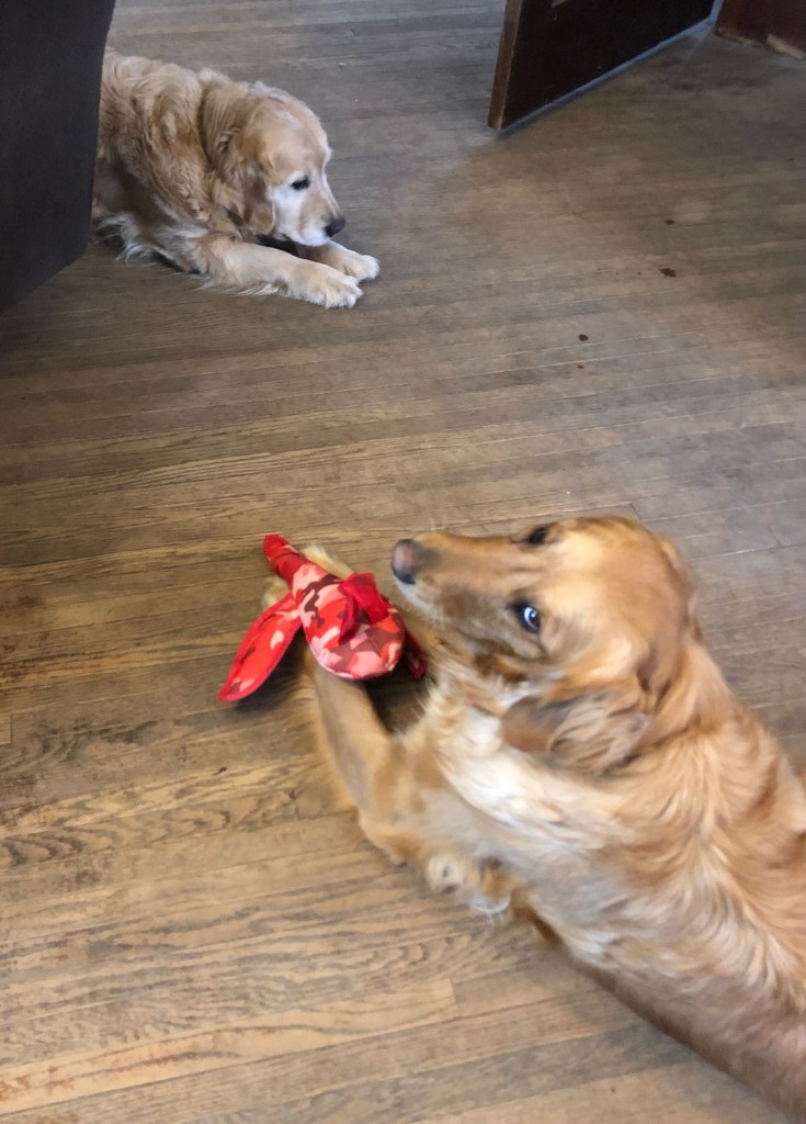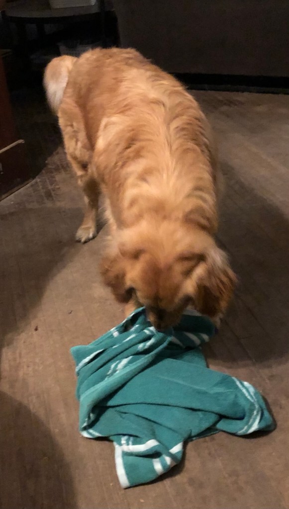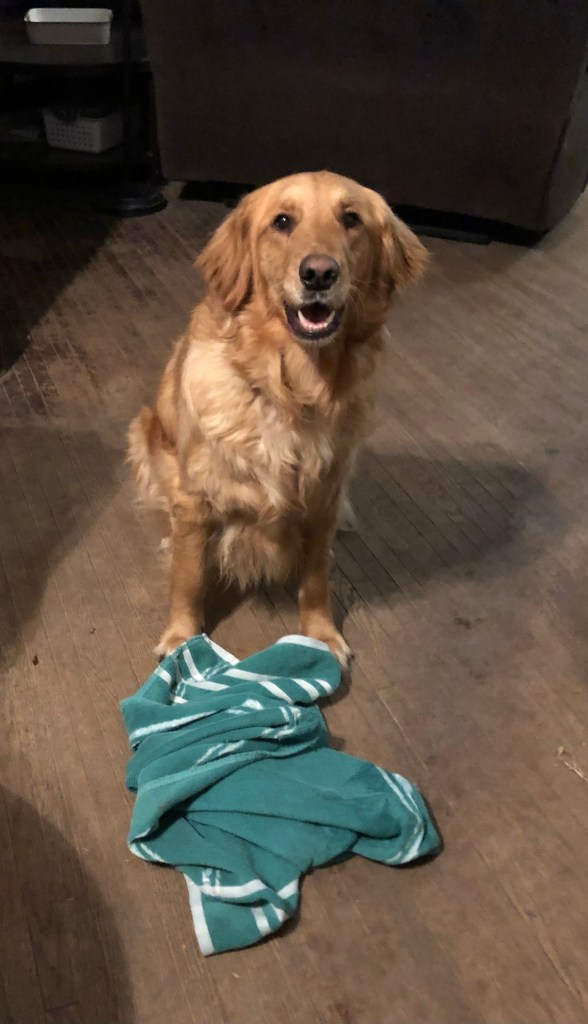 It took a few minutes but I showed that towel who was boss! Wipe the rain off of my sister will you! Humph, not on my watch you won’t! ~Bea Pup